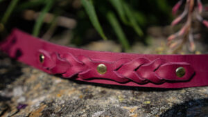 The plain collar is made out of one piece of oiled leather. It has a roller buckle as closure, a leather loop and a metal D-ring for the leash. An additional braid as decoration can be added. The closure holes are finished with eyelets.